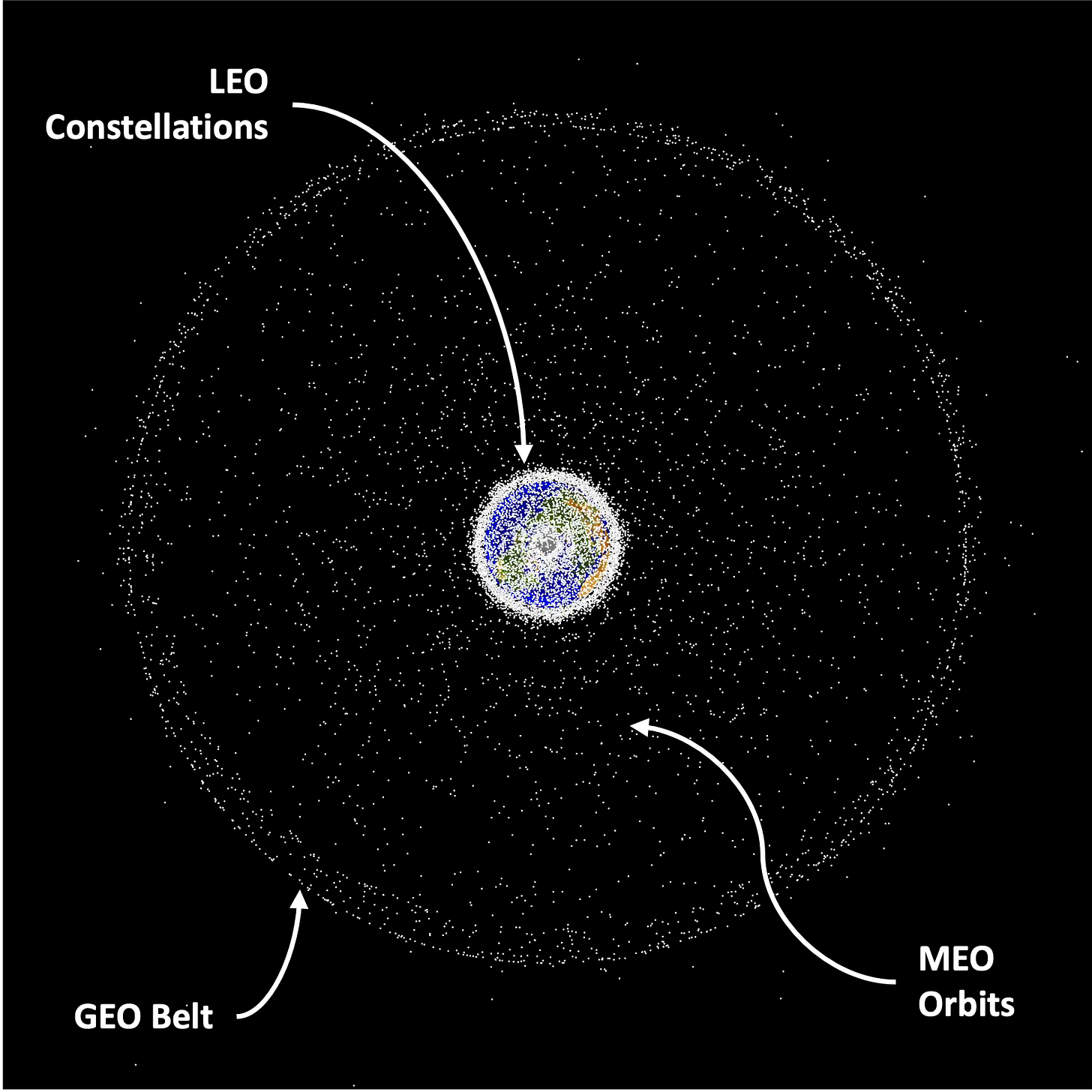 The image above is from NASA’s Orbital Debris Program Office and illustrates satellites in orbit from 2019, as seen from a viewpoint above the north pole. The well-populated equatorial GEO belt can be clearly observed, as well as the LEO and MEO orbital densities.