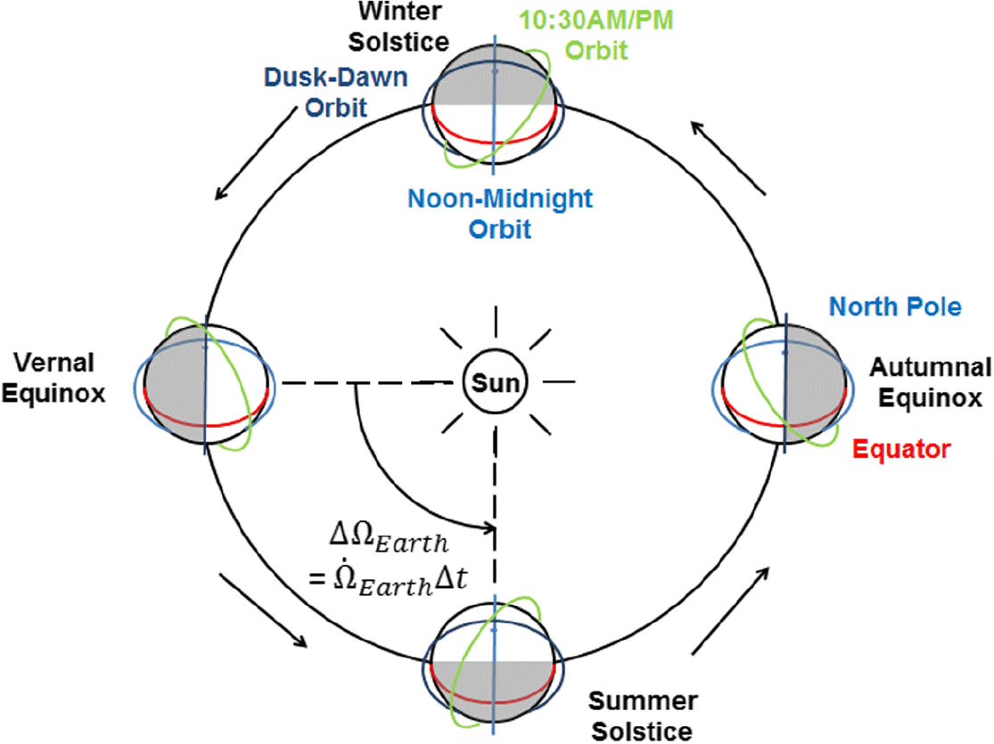 Sun-synchronous orbits solve this. They exploit Earth’s equatorial bulge — the J2 perturbation to be specific — to precess the orbital plane at exactly the rate Earth orbits the sun. The result is that the satellite crosses every latitude at the same local solar time, every day, year-round.