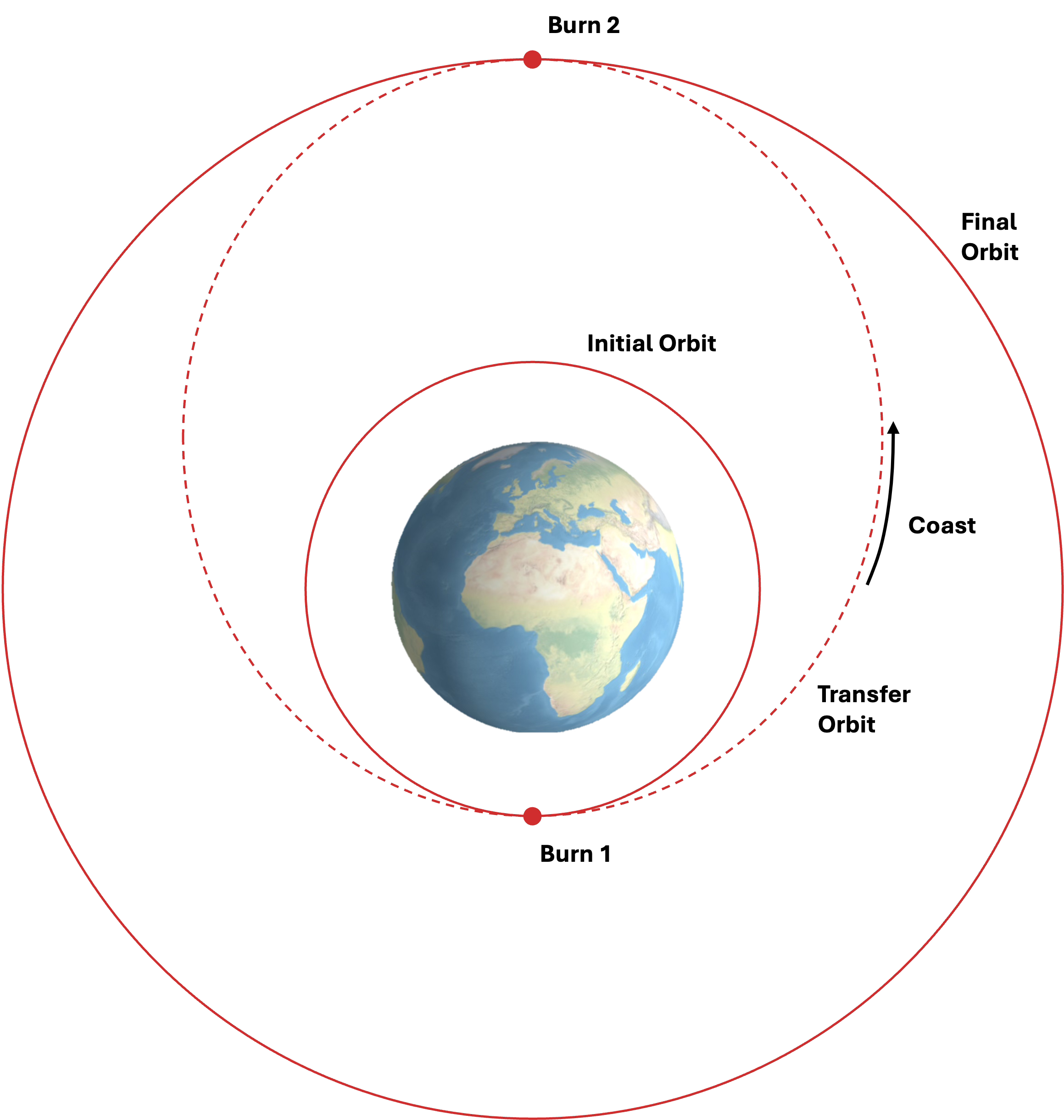 This maneuver moves a spacecraft from a circular orbit to an elliptical orbit and then back to a higher circular orbit. Starting in the first, low circular orbit, the spacecraft burns to raise apogee, entering an elliptical transfer orbit. It coasts to the high point — about five hours for LEO to GEO — then burns again to circularize. Moving from LEO to GEO costs about 4 km/s this way.