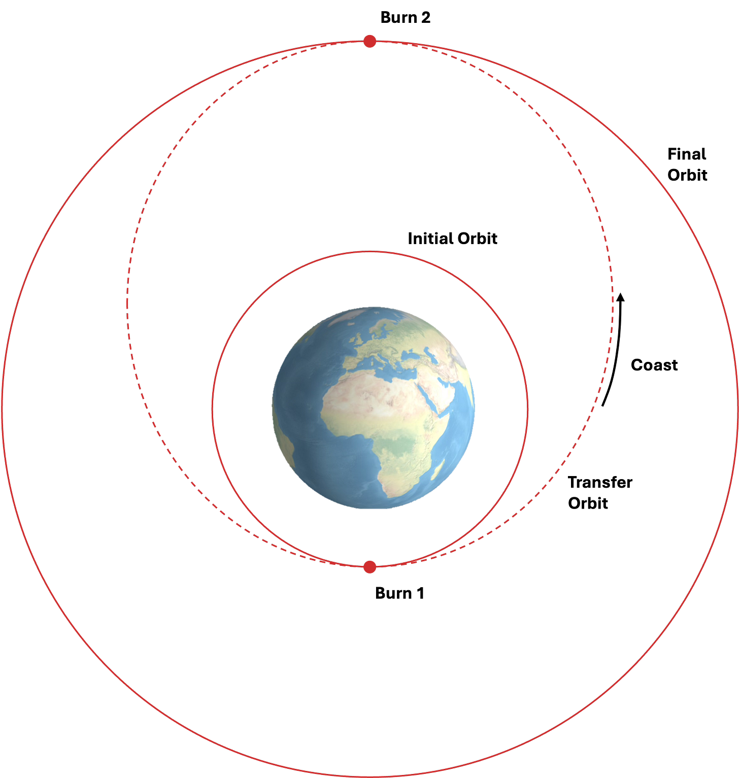 Getting there is also expensive. As we’ll see below, orbital mechanics demands significant energy to get to GEO, which first requires traversing the geosynchronous transfer orbit (GTO), a Hohmann transfer as outlined below.