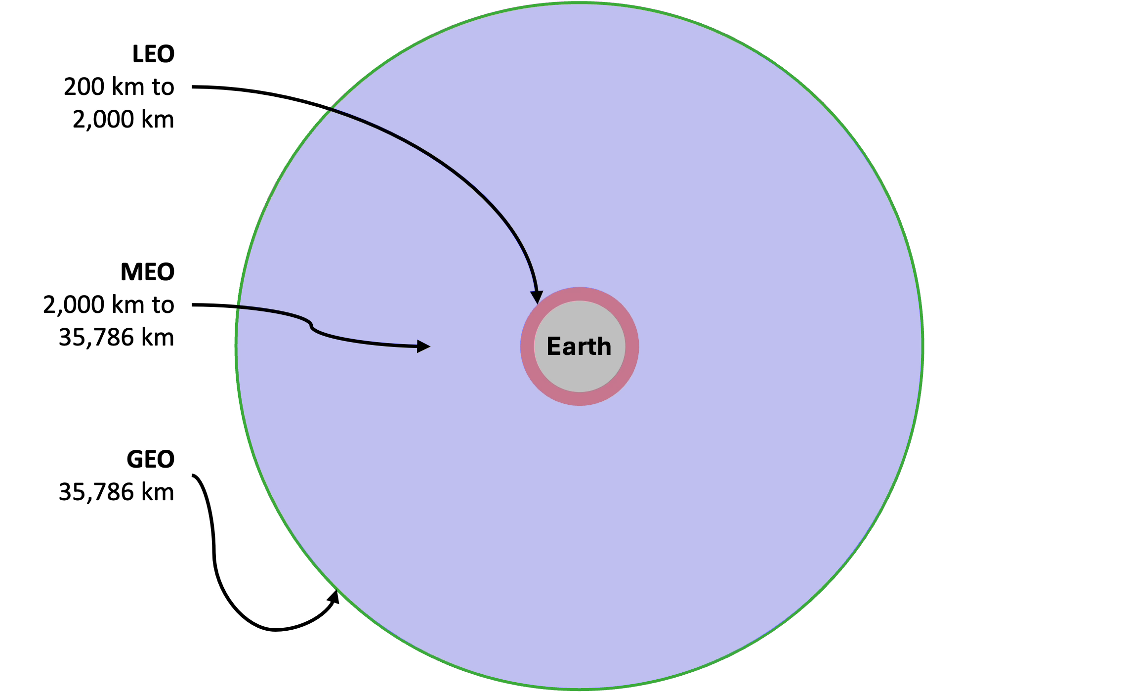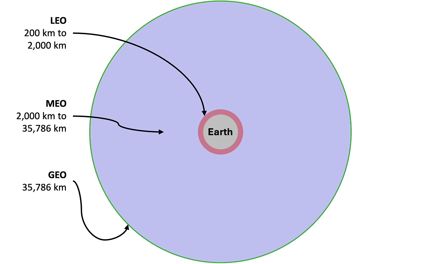 Medium Earth orbit — roughly 2,000 to 35,786 km — splits the difference between LEO and GEO.