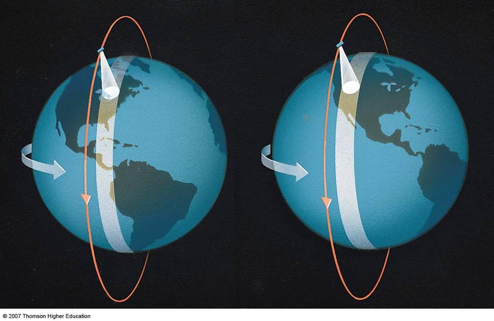 A polar orbit passes over both poles. In other words, the satellite circles the Earth from north to south. As Earth rotates beneath, each successive pass covers a new strip of ground. Wait long enough, and you’ve seen everything.