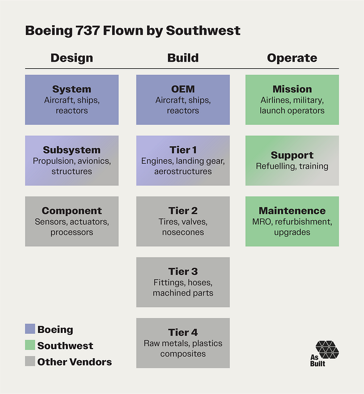 The operations phase reveals a key distinction. Boeing is no longer at the top. Instead, airlines such as Southwest and Alaska Airlines provide mission services by flying customers around the world.