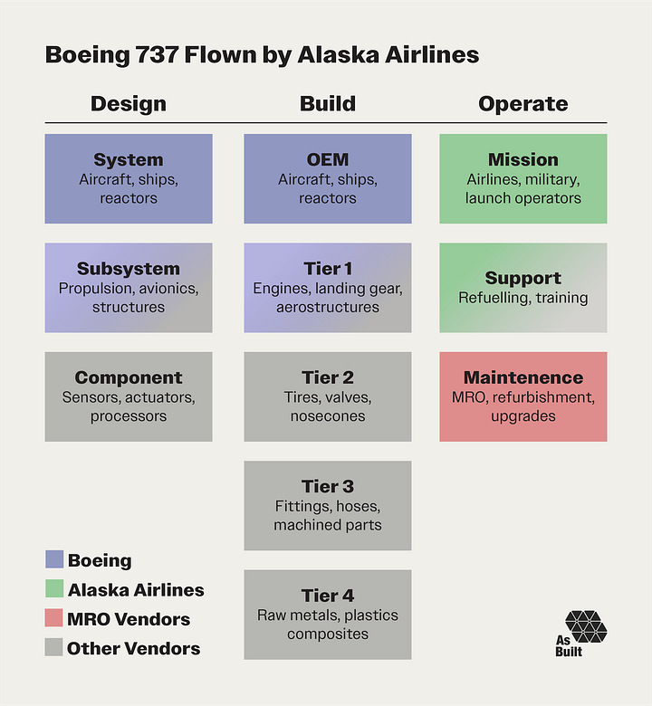 When it comes time to manufacture the plane, Boeing does the final aircraft integration as the OEM. Tier 1 systems are mostly outsourced. Engines come from CFM. Spirit AeroSystems makes the fuselage. Down at Tier 2, Collins Aerospace provides components and mechanisms. In total, the 737 reportedly has 600 suppliers across the Tier 1 & 2 levels, and even more are expected at the lower levels. Tier 4 materials are mostly outsourced, with companies such as Hexcel and Toray Industries supplying composites and other materials for the structural assemblies.